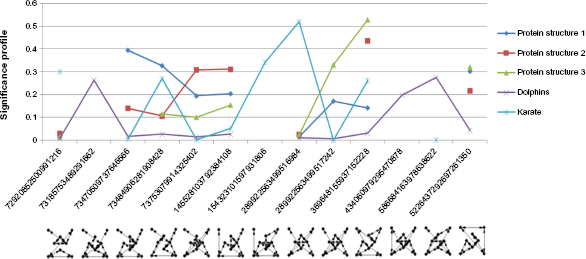 The dolphin social network also has the same significant three- and four-node motifs with three protein structures (ID 238 for three-node; IDs 13278 and 4958 for four-node). In addition, it shares the second and third significant five-node motifs with protein structure 2 (IDs 5361086 and 9997502, respectively). Besides, it shares the most significant six-node motif with protein structure 2 (ID 10830560094). These observations can be seen in Supplementary Table 2. Furthermore, the PCC score revealed a strong positive relationship between the dolphin social network and protein structure 3 (PCC score 0.7333). However, there are less strong positive relationships between the dolphin social network with protein structure 1 and protein structure 2 (PCC scores 0.6690 and 0.6834, respectively). These observations suggest that the dolphin social network shares low-level community structure (three and four nodes) with three protein structures. It also suggests that the dolphin social network and three protein structures belong to a superfamily. 5