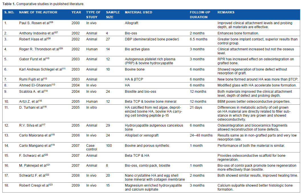 Since its introduction in the mid-1980s, HA has been investigated for its clinical viability in various bone defects. Many researchers have demonstrated a better initial osseointegration and a high short-term success rate.96–98 HA-coated implants showed varying results of survival.99–105 The literature review revealed many studies revolving around these materials.106–149 Different forms of HA have been derived from different origins for various uses. Bovine HA124–135 and synthetic HA136–149 are major sources of HA grafts. These have shown varying success rates. Few studies have compared the efficacy of one form of HA over the other.106–123 HA use in the enhancement of bone regeneration in cystic defects has been selected for discussion. Many published studies have discussed about the implants and HA, which has been described briefly in previous sections.11,53,54 Available studies are divided mainly into bovine, synthetic, and comparative studies for the convenience of discussion and enumeration of the drawbacks and advantages collectively, as well as to discuss the emerging technology in the production with a note on recent materials over old ones.