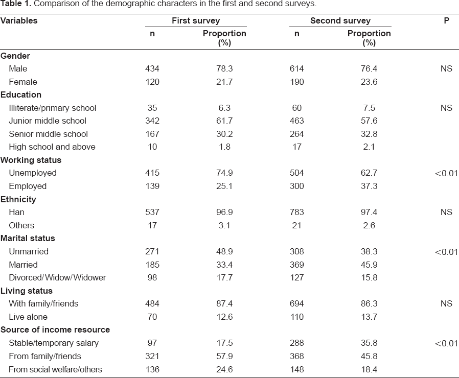 Data were entered in Epidata 3.0 (Epidata Association, Odense, Denmark) and analyzed using the SPSS version 13.0 statistical software package. Continuous variables were represented as mean ± standard deviation, while categorical variables were represented as percentages. The Chi-square and Fisher's exact tests were used to examine the differences in social and behavioral characteristics between the 2 surveys. The p value was reported for a two-tailed statistical test, while α < 0.05 was considered to be statistically significant. Multivariable logistic regression analysis was used to identify factors that affected changes in behavior related to heroin use, sexual intercourse, and social interactions. Explanatory variables were categorized on the basis of their distribution as follows: gender, 2 categories (male or female); education, 2 categories (junior middle school and below or senior middle school and above); marital status, 3 categories (never married, married (first marriage or second marriage), or divorced); working status, 2 categories (unemployed or employed); living status, 2 categories (alone or with others); and source of income, 2 categories (own salary or supported by others).