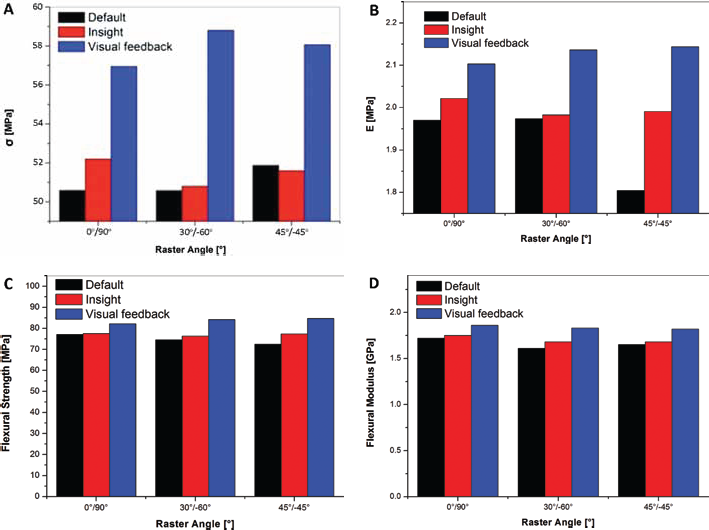The printing parameters showed a marked effect on the tensile properties (Tab. II; Fig. 2A, B) independently of the raster angle used. When a 0°/90° raster angle was used, e.g., the tensile strength increased from 49.13 to 52.28 MPa for samples printed according to the default and visual methods, respectively. For the same samples, the tensile modulus varied from 1.97 to 2.10 GPa.