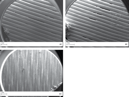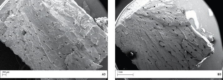 The high degree of differences exhibited in the tensile properties for PC can be explained as the result of the presence of a decreasing number of voids (Fig. 3) for the printed specimens (e.g., A1, A2, A3) when the printing parameters, especially the RRAG, were optimized (Tab. I). Decreasing the RRAG from 0 to -0.013 mm caused the disappearance of raster to raster voids. The change in the raster width from 0.508 to 0.432 mm (from default to insight method; Tab. I) did not have any appreciable effect on the presence of raster to raster voids. Nevertheless, it must be noted that even for the optimized sample, the analysis of cryogenically fractured cross-sections evidenced the presence of voids (Fig. 4). These voids are typical of FDM-printed specimens and are inevitable.