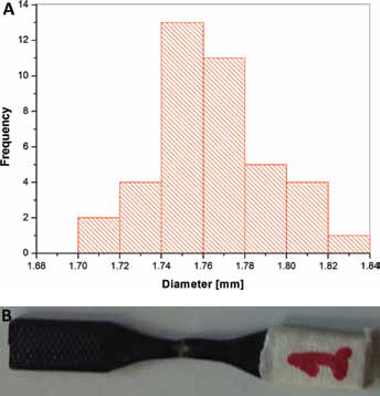 The filament diameters were checked (n = 40 measurements) before performing the PEEK printing, to ensure correct processing in the FDM machine. The analysis (Fig. 5A) showed an average diameter of 1.76 ± 0.03 mm. The filament here produced presented a diameter distribution similar to those of the best filaments available on the market. Tensile specimens were then prepared by FDM using a nozzle temperature of 420°C, higher than that used for the extrusion of the PEEK filament (i.e., 370°C). The nozzle temperature was set to a high value because of the need to melt the PEEK filament in the nozzle, in a short time, with no aid from mixing, as happens in the extruder. The quality of the PEEK printed specimens was good, as demonstrated by the optical analysis (Fig. 5B) and further confirmed by SEM analysis of the fractured specimens.