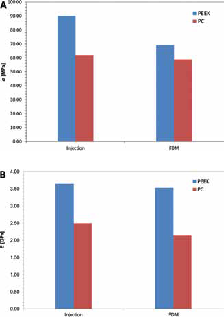 Mechanical properties for polyetheretherketone (PEEK) and polycarbonate (PC). Comparison between injection-molded and fused deposition modeling (FDM)–printed specimens: tensile strength (