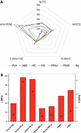 A different comparison, with filaments offered by Stratasys for functional applications, is reported in Figure 8B for tensile properties only (Tab. III). PEEK, once again, showed higher tensile strength and modulus compared with neat polymers. However, Carbon PA presented better properties compared with PEEK, due to the presence of carbon fiber reinforcements in the Carbon PA formulation. As PEEK can be used as matrix for carbon-filled composite, the next steps will be a feasibility study of extruding Carbon/PEEK composite to verify its possible use for the FDM-printing process.