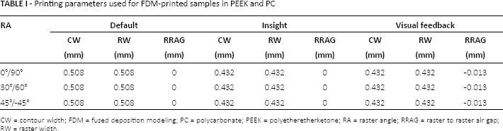CW = contour width; FDM = fused deposition modeling; PC = polycarbonate; PEEK = polyetheretherketone; RA = raster angle; RRAG = raster to raster air gap; RW = raster width.