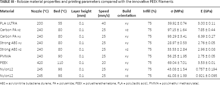 Roboze material properties and printing parameters compared with the innovative PEEK filaments