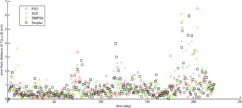 In this section, a comparison of the linear simplex method [27] with other optimization methods to solve the nonlinear equation in (4), which may contain local minima, is presented. The optimization methods that are tested in the experiments for comparison are PSO [24], SCE [25] and SIMPSA [26]. Figure 8 and Table 1 show the error in the distance in the transformation matrix T(x, y, θ) by comparing it with the global (ground truth) solutions. We found that all the averages and standard deviations are below the scale (1cm) in this experiment. Hence, all the methods yield accurate transformation matrices. On the other hand, Figure 9 and Table 2 compare the distance from the robot's position to the original position. The errors of the position are higher than the errors of the transformation matrix. Table 2 shows that Simplex is the most efficient in terms of computational time, while PSO spends nearly 100 times the time that Simplex consumes in the performed 2D mapping experiment. For accuracy comparison, PSO and SCE produced solutions closer to the global solutions, while SIMPSA and Simplex show larger errors.